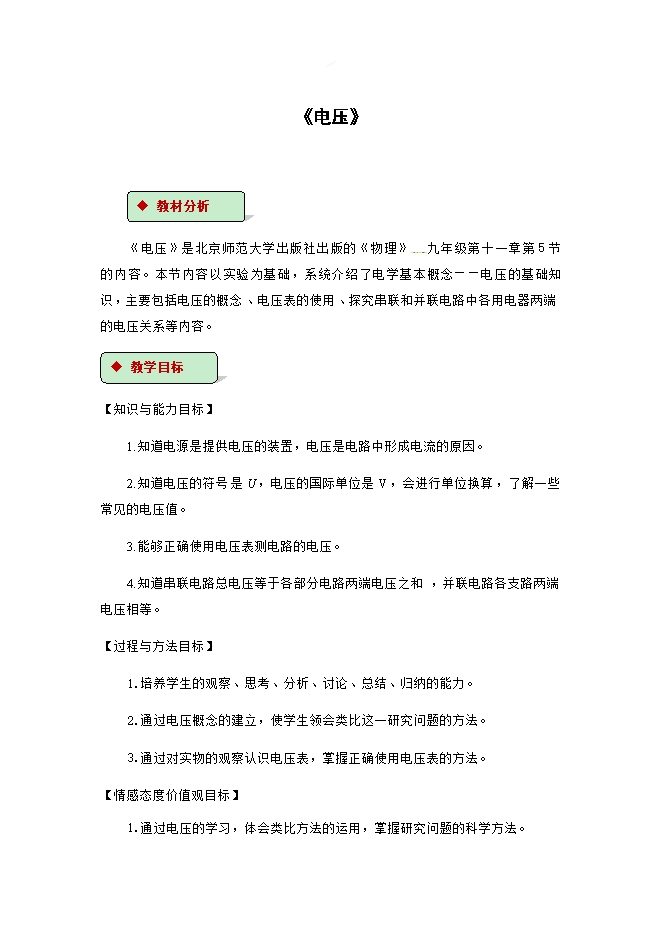 【内容简介】《电压》是北京师范大学出版社出版的《物理》九年级第十一章第5节的内容。本节内容以实验为基础,系统介绍了电学基本概念——电压的基础知识,主要包括电压的概念、电压表的使用、探究串联和并联电路中各用电器两端的电压关系等内容。