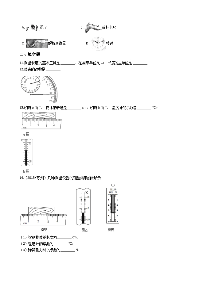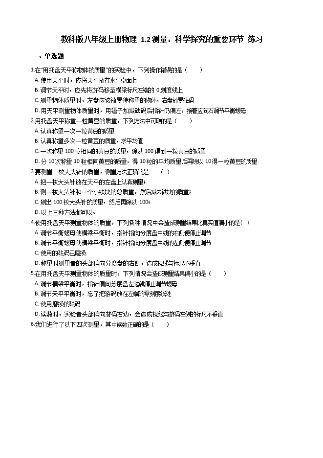 2018-2019教科版八年级上册物理练习题:1.2测量:科学探究的重要环节(附答案)