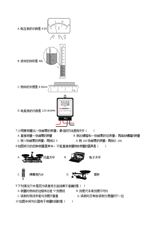 【内容简介】1.在“用托盘天平称物体的质量”的实验中,下列操作错误的是( ) A. 使用天平时,应将天平放在水平桌面上B. 调节天平时,应先将游码移至横梁标尺左端的0刻度线上C. 测量物体质量时,左盘应该放置待称量的物体,右盘放置砝码D. 用天平测量物体质量时,用镊子加减砝码后指针仍偏左,接着应向右调节平衡螺母