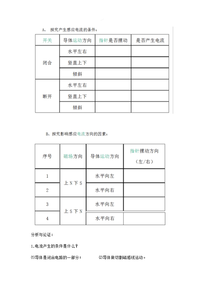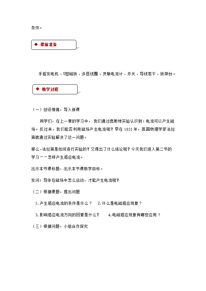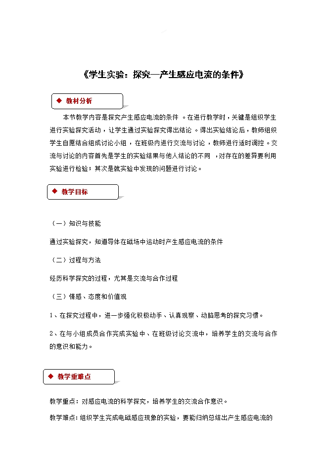 【内容简介】本节教学内容是探究产生感应电流的条件。在进行教学时,关键是组织学生进行实验探究活动,让学生通过实验探究得出结论。得出实验结论后,教师组织学生自愿结合组成讨论小组,在班级内进行交流与讨论,教师进行适时调控。交流与讨论的内容首先是学生的实验结果与他人结论的不同,对存在的差异要利用实验进行检验;其次是就实验中发现的问题进行讨论。