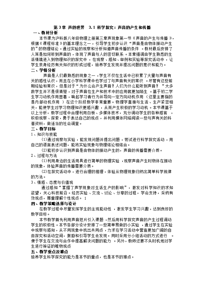 - 6512021秋沪科版物理八年级上册第3章《3.1 科学探究:声音的产生与传播》教案