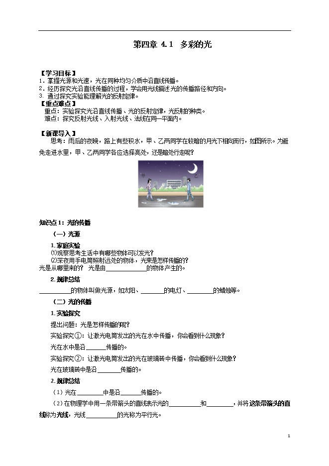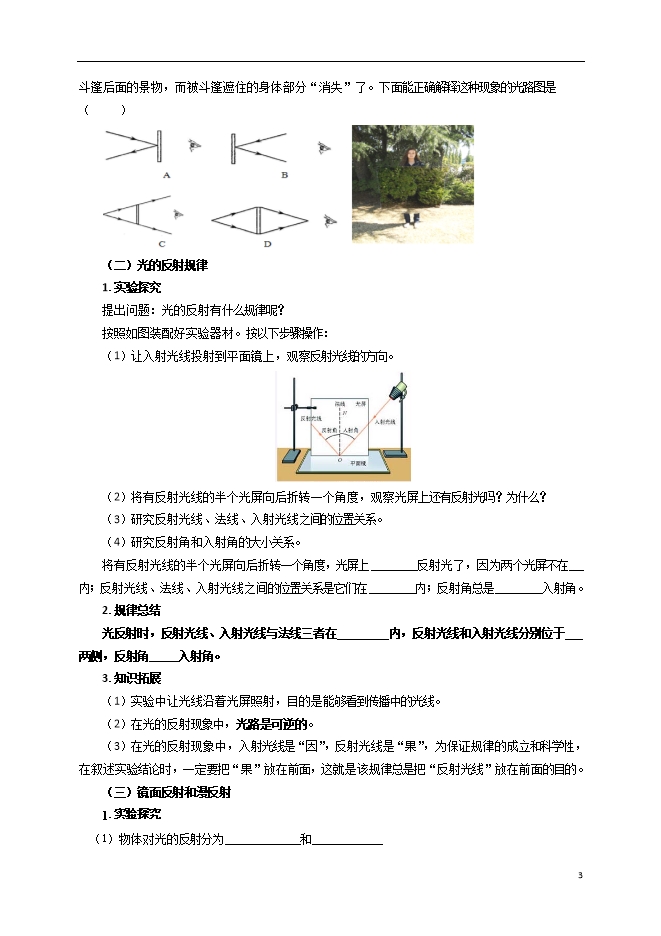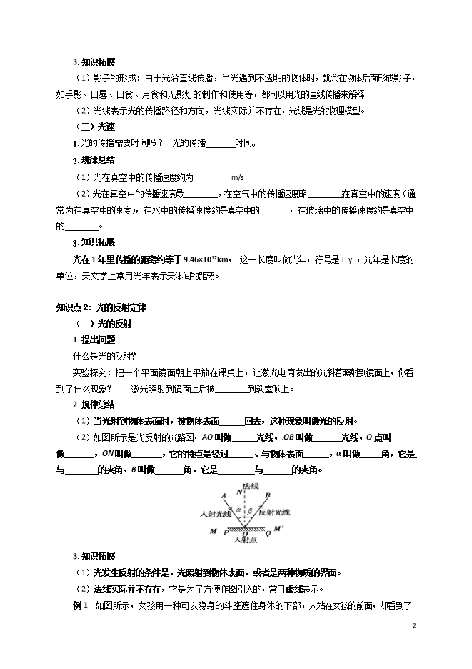 【内容简介】1.掌握光源和光速,光在同种均匀介质中沿直线传播。2.经历探究光沿直线传播的过程,学会用光线描述光的传播路径和方向。3. 通过探究实验能理解光的反射定律。