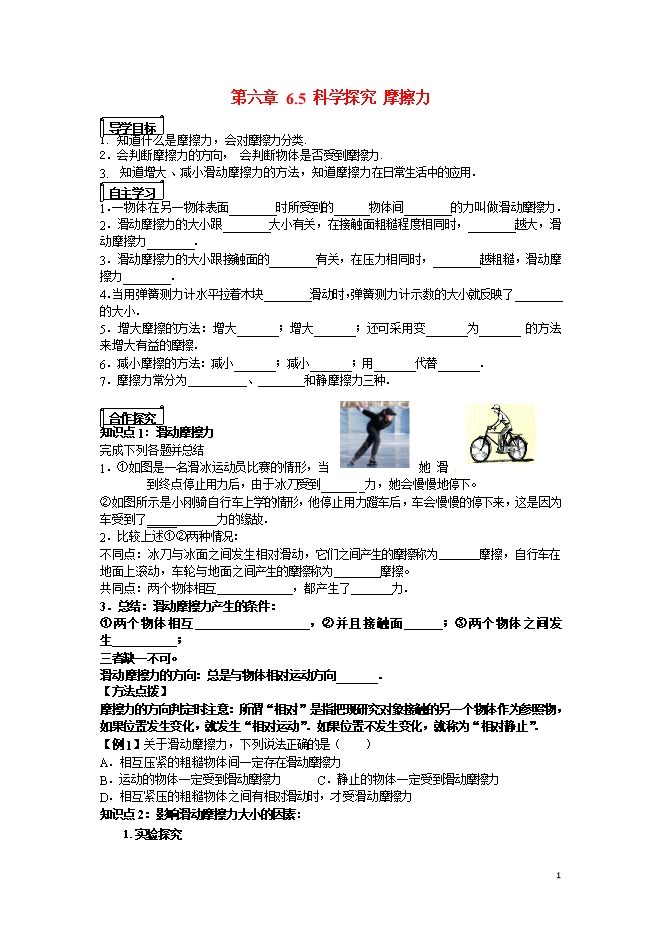 沪科版八年级物理学案与同步练习:6.5科学探究:摩擦力