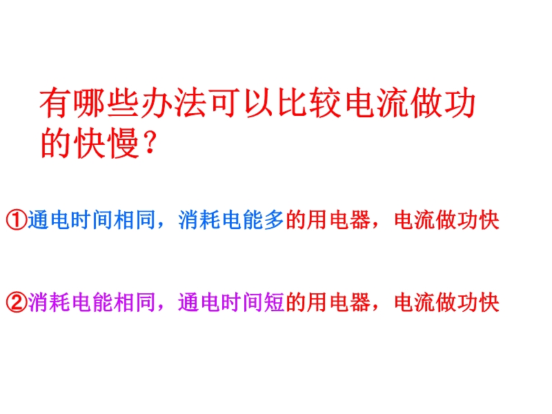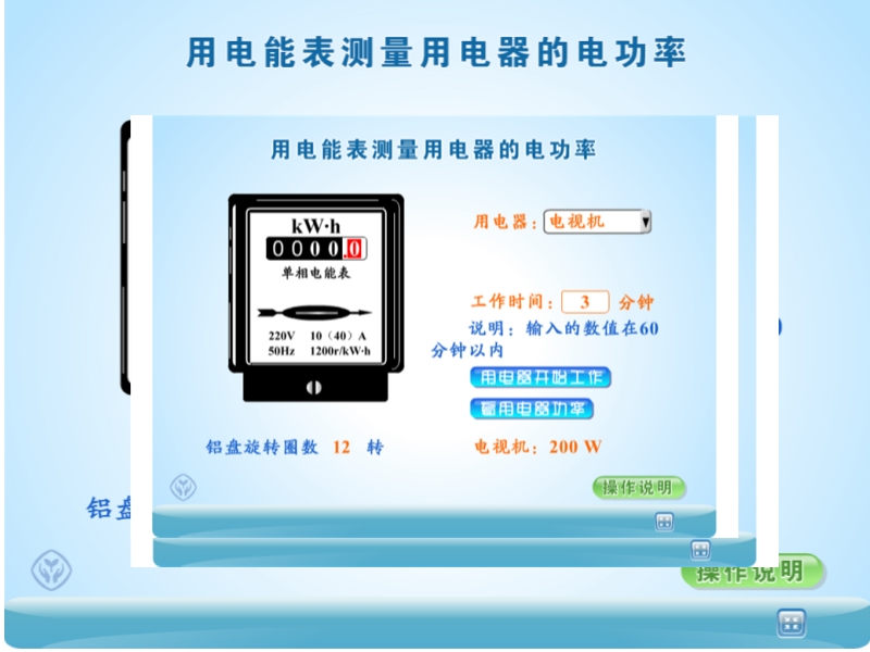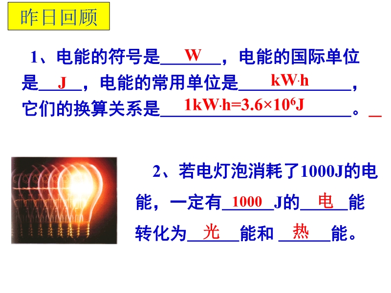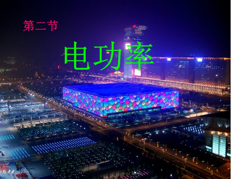 【内容简介】人教版:《18.2电功率》ppt课件,共有46张幻灯片和1个动画。课件首先引导学生学习了电功率的概念、计算、意义、单位等,再利用视频展示了用电器在不同的电压的亮度和功率等,课件中有例题和习题,能提高学生的应用技能。