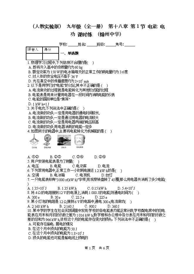 (人教实验版)锦州中学九年级物理课时练:18.1电能 电功(附解析)