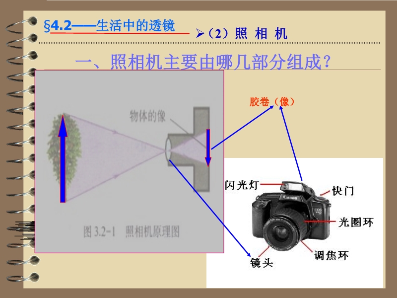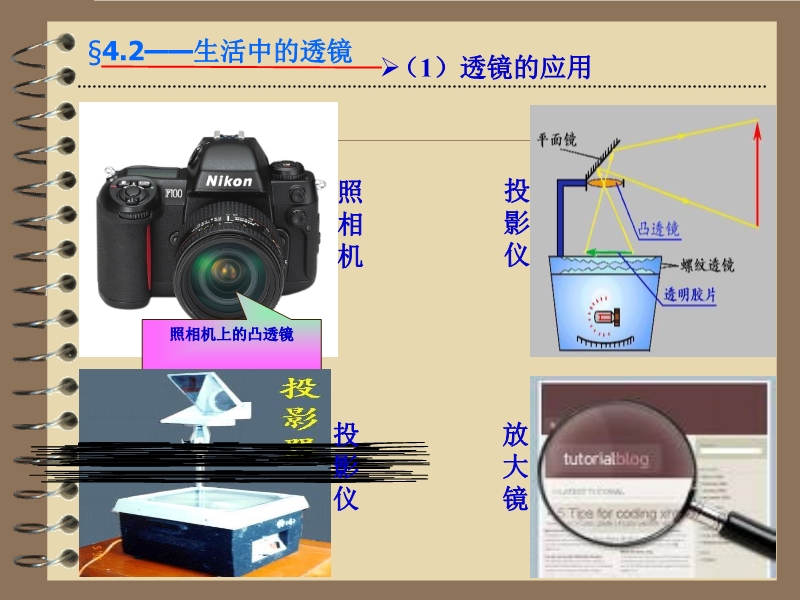 【内容简介】人教版:《5.2生活中的透镜》PPT课件,课件共31张幻灯片,课件主要引导学生认识透镜在生活中的应用,向学生展示了光学照相机的基本结构和工作原理;引导学生探讨了投影仪的基本结构和工作原理及放大镜的使用、成像特点等。