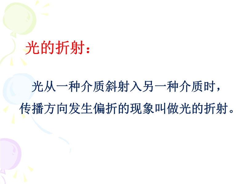 【内容简介】人教版:《4.4光的折射》PPT+视频,共有22张幻灯片。课件引导学生对光的折射思考,引导学生认识了光的折射现象,并用动画演示了光从空气斜射入水中和从水中斜射入空气中时发生的折射规律,课件还展示了生活中的一些折射现象,并引导学生应用折射解释简单的现象