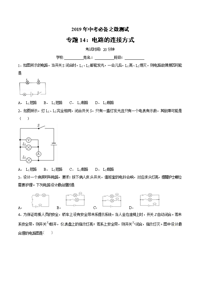 2019年中考物理必备之微测试:专题14 电路的连接方式(word原卷版和解析版)