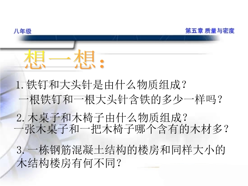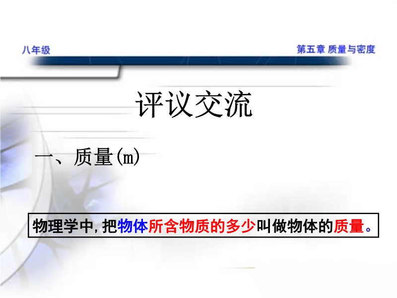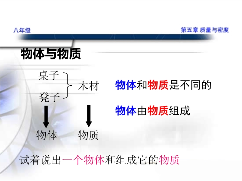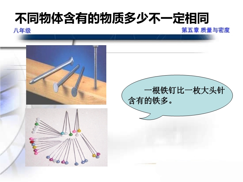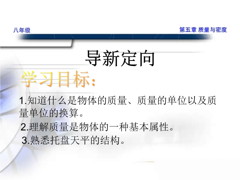 【内容简介】沪科版八年级物理《5.1 质量》PPT教学课件,共有28张幻灯片。主要引导学生学习了质量的概念、单位,认识了质量是物质的一种属性,课件还向学生展示了测量质量的工具,重点引导学生认识了天平的构造,讨论了天平的使用.
