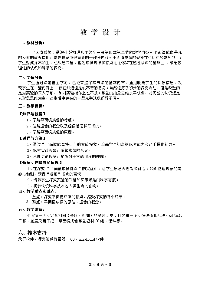安师大附外城东校区:沪科版《4.2平面镜成像》ppt+教案
