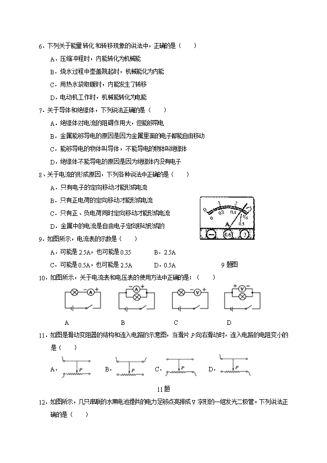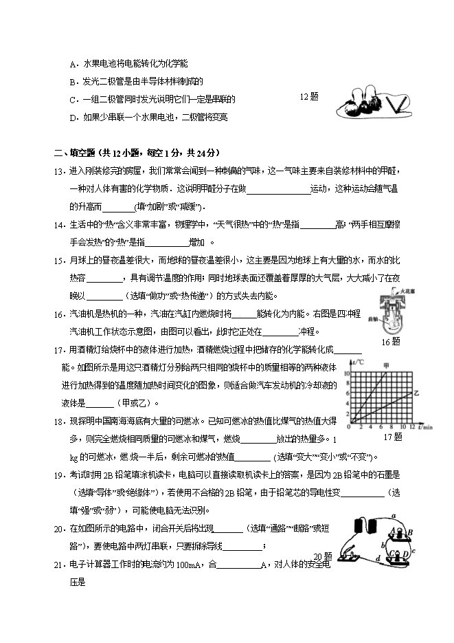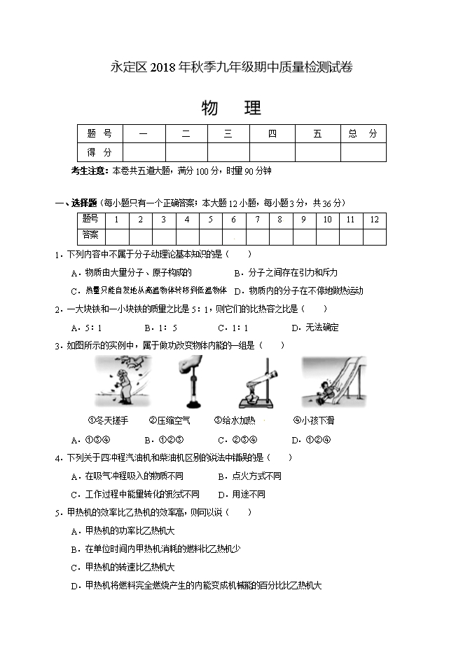 湖南省张家界市永定区2019届九年级上学期期中考试物理试题及答案