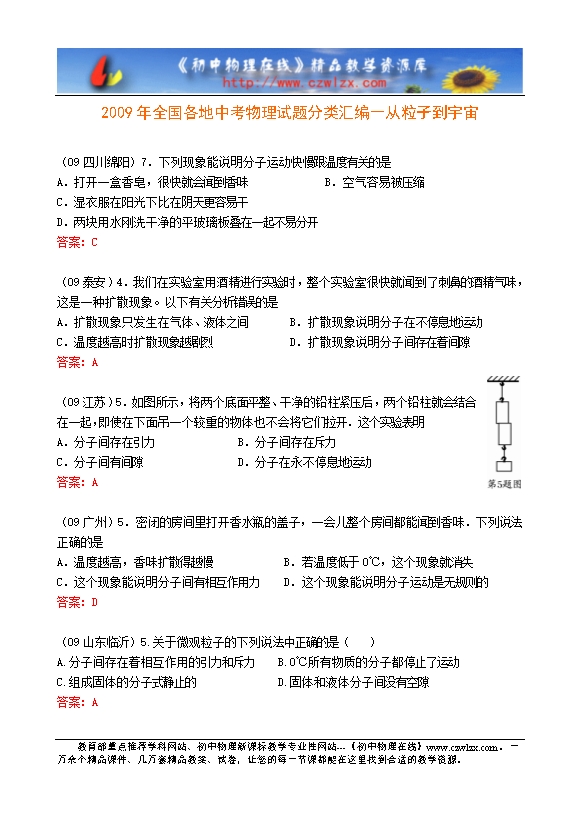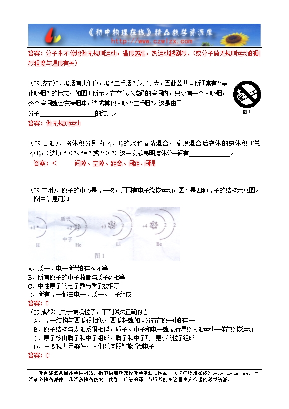 2009年全国各地中考物理试题分类汇编—从粒子到宇宙