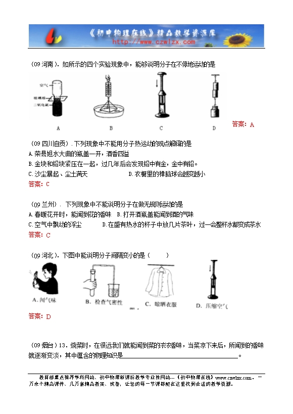 【内容简介】(09四川绵阳)7.下列现象能说明分子运动快慢跟温度有关的是