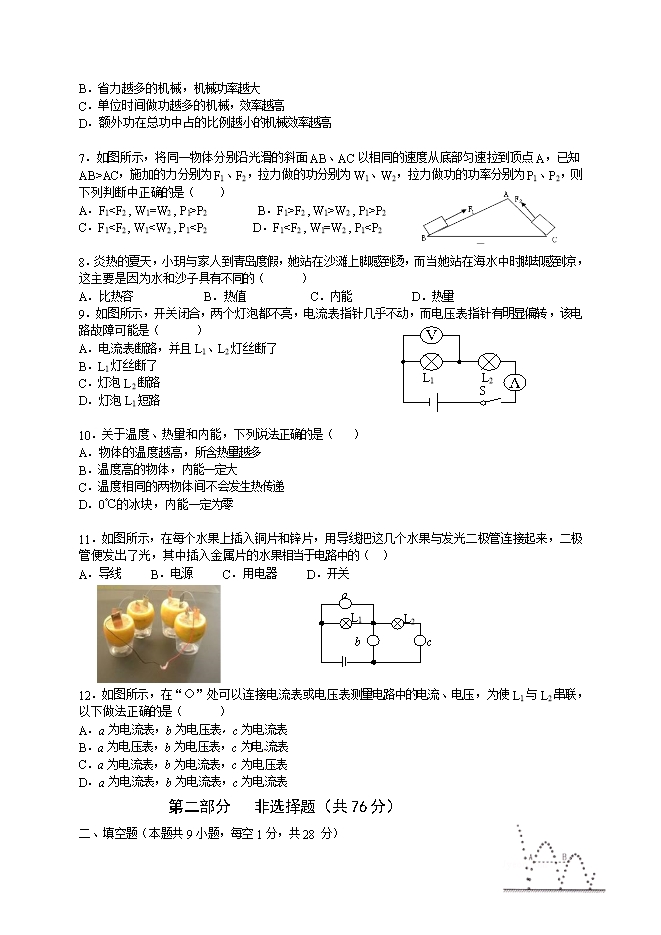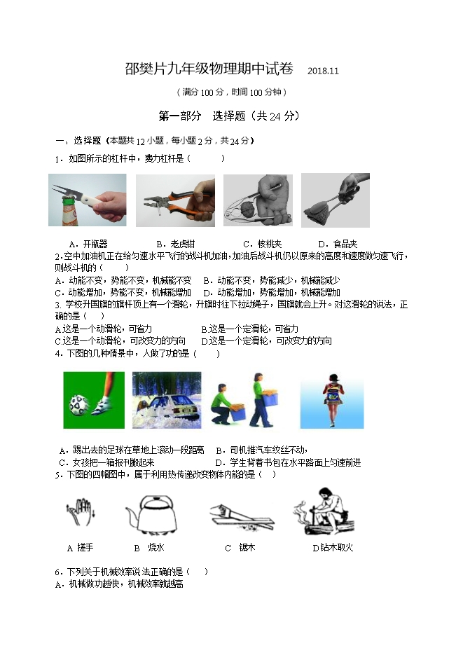 江苏省扬州市邵樊片2019届九年级上学期期中考试物理试题及答案