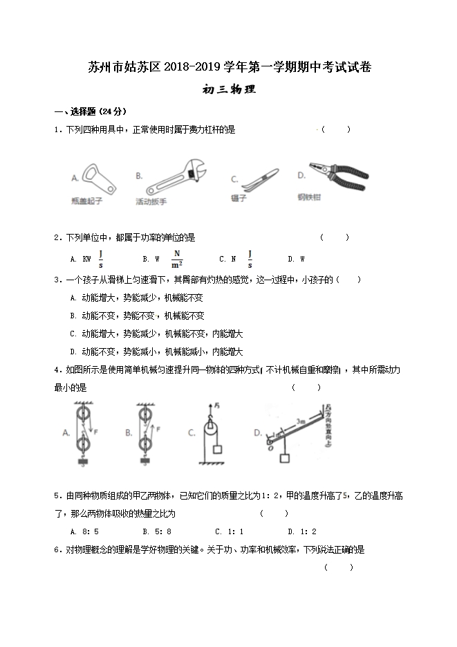 江苏省苏州市姑苏区2019届九年级上学期期中考试物理试题及答案