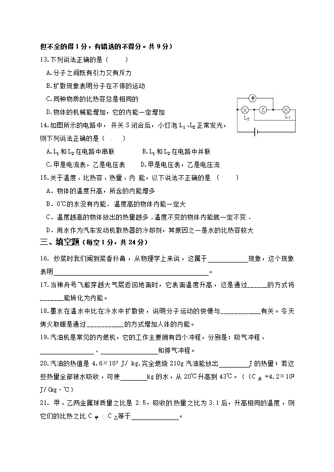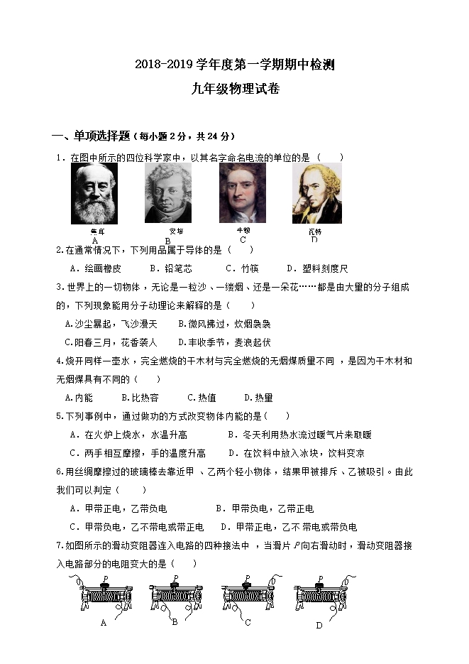 - 1115山东省滨州市2019届九年级上学期期中考试物理试题及答案