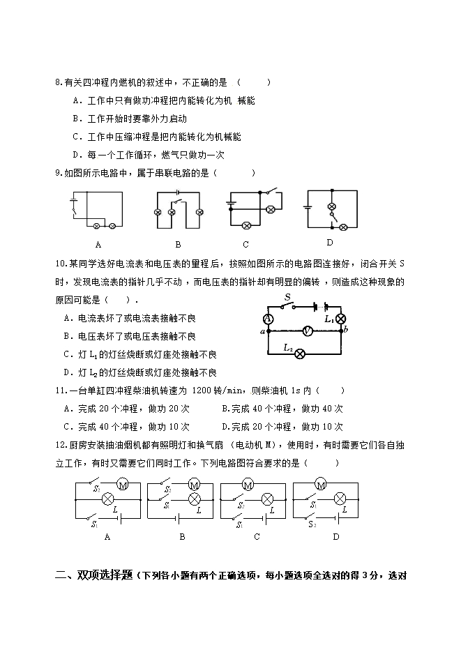 - 928吉林省长春市第七十二中学2019届九年级上学期期中考试物理试题(无答案)