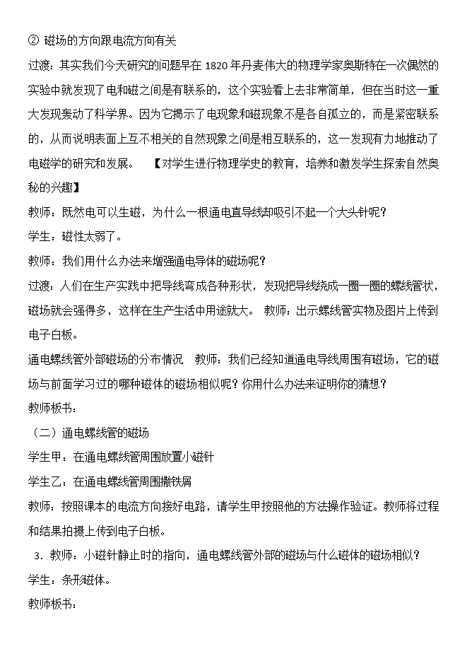 【内容简介】人教版:《20.2电生磁》ppt课件,共33张幻灯片,引导学生了解了通电地导线周围存在磁场的实验现象,分析了磁场的方向与电流方向的关系。课件用图片展示了通电螺线管周围的磁场的分布特点,研究了通电螺线管的磁场的特点, 画、握、定三个环节解读安培定则。