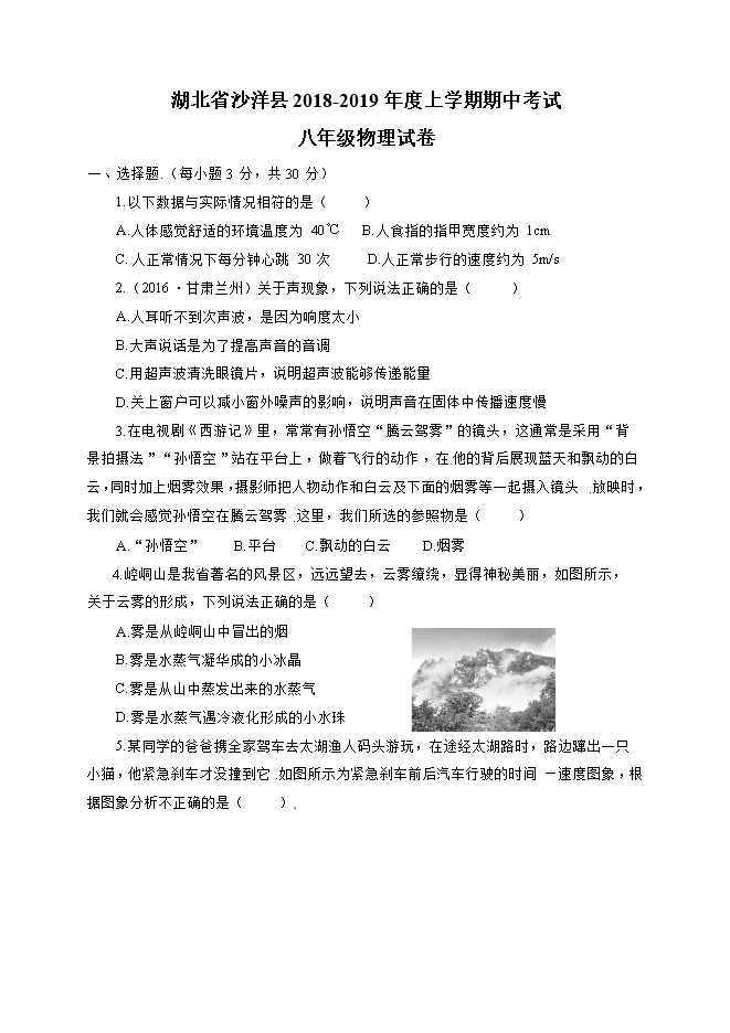 湖北省沙洋县2018-2019学年八年级上学期期中考试物理试题及答案