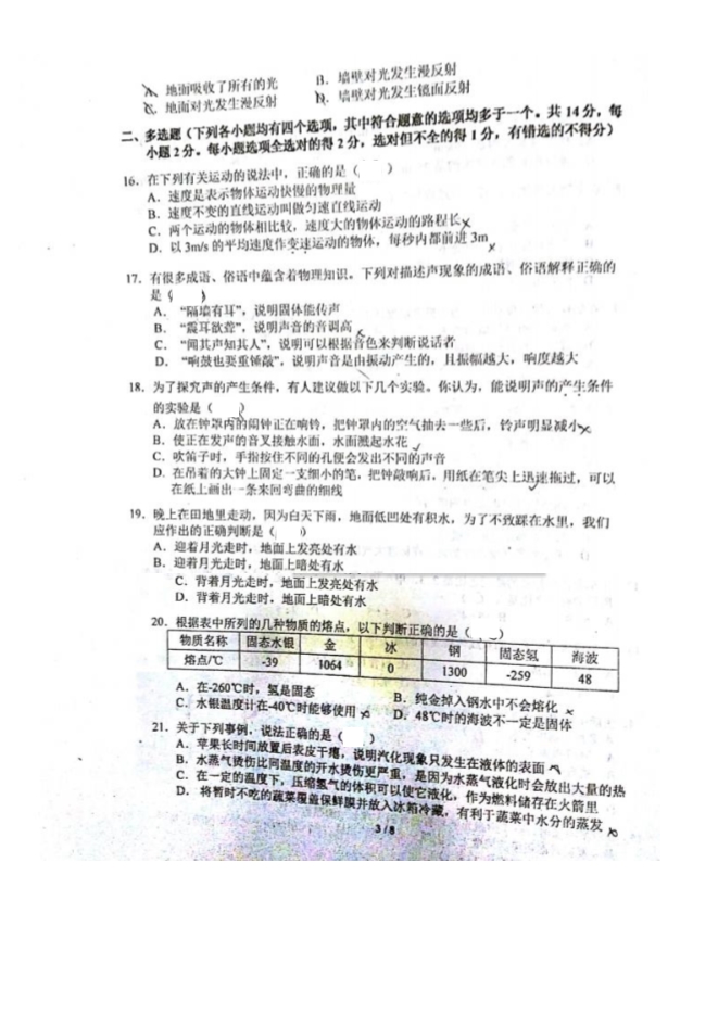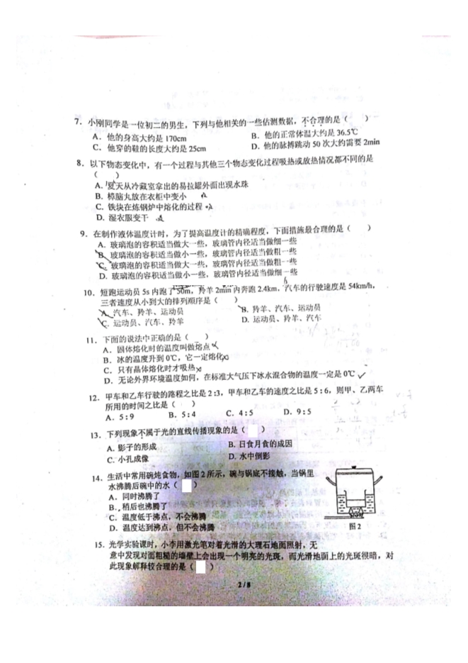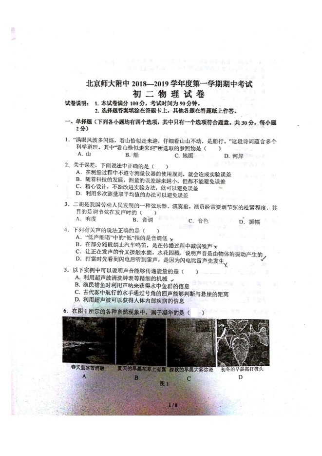 北京师范大学附属中学2018-2019学年第一学期初二年级物理期中考试试卷(PDF)