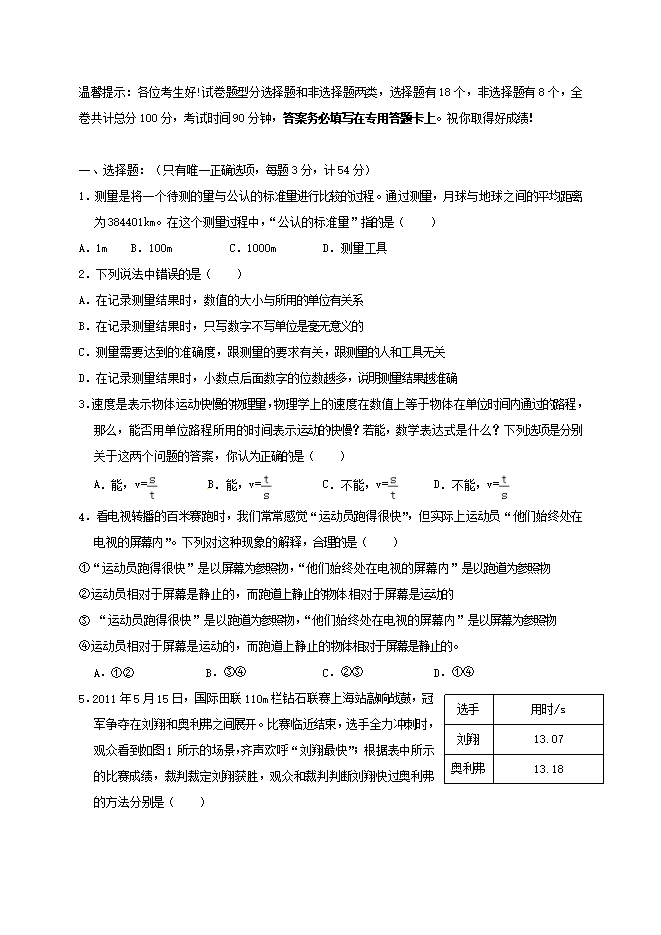 5.2011年5月15日,国际田联110m栏钻石联赛上海站敲响战鼓,冠军争夺在刘翔和奥利弗之间展开。比赛临近结束,选手全力冲刺时,观众看到如图1所示的场景,齐声欢呼“刘翔最快”;根据表中所示的比赛成绩,裁判裁定刘翔获胜,观众和裁判判断刘翔快过奥利弗的方法分别是( )