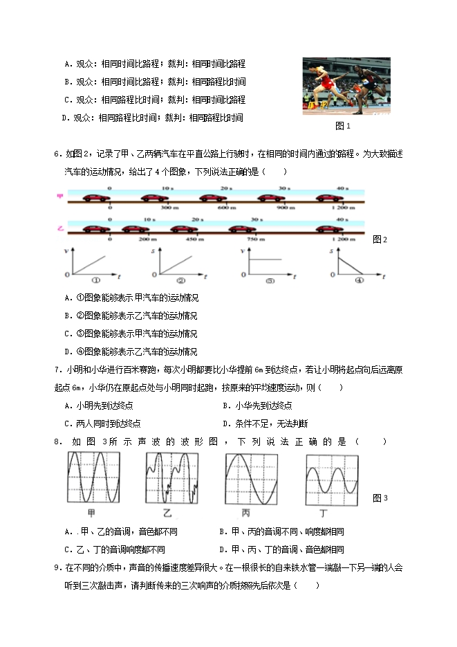 6.如图2,记录了甲、乙两辆汽车在平直公路上行驶时,在相同的时间内通过的路程。为大致描述汽车的运动情况,给出了4个图象,下列说法正确的是( )
