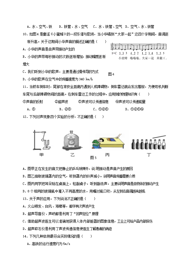 10.如图4是童谣《小蜜蜂》的一段乐谱与歌词,当小华唱到“大家一起”这四个字期间,音调逐渐升高。关于这期间小华声音的描述正确的是( )