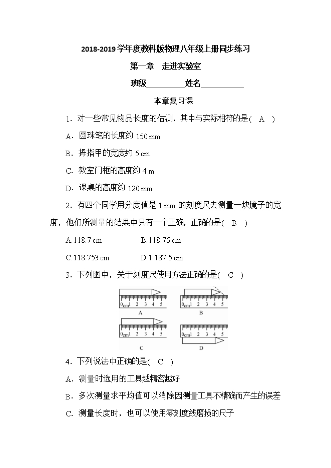 2018-2019学年度教科版物理八年级上册同步练习:第一章 走进实验室 复习课