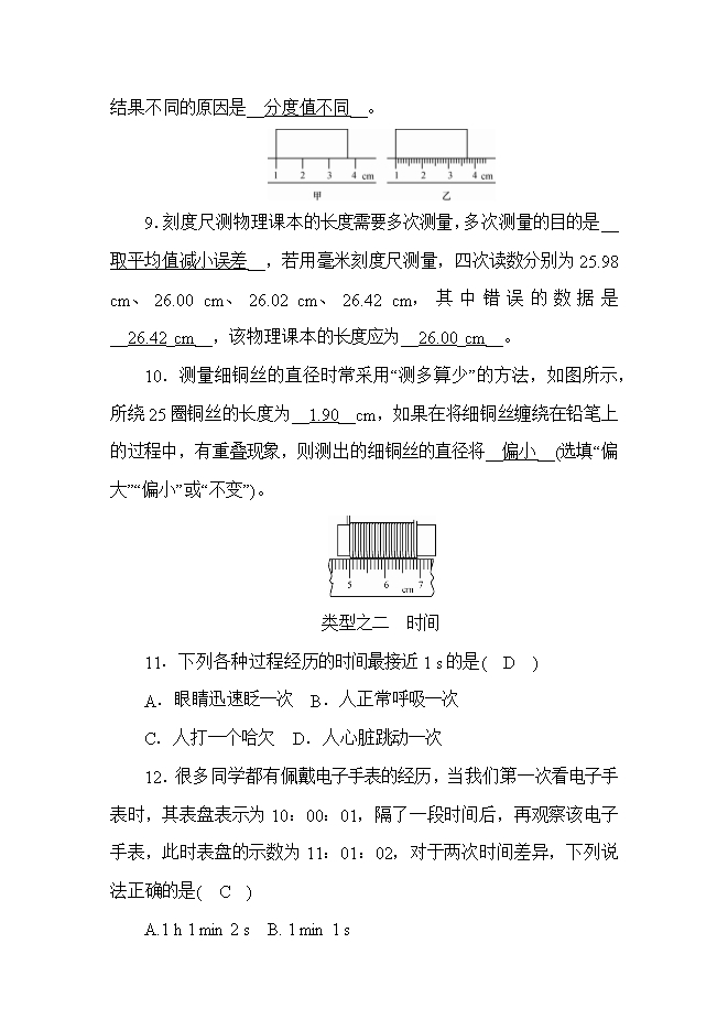 9.刻度尺测物理课本的长度需要多次测量,多次测量的目的是__取平均值减小误差__,若用毫米刻度尺测量,四次读数分别为25.98 cm、26.00 cm、26.02 cm、26.42 cm,其中错误的数据是__26.42_cm__,该物理课本的长度应为__26.00_cm__。