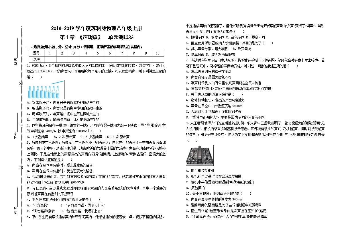 2018-2019学年苏科版八年级上册物理第一章 声现象 单元测试题(含答案)