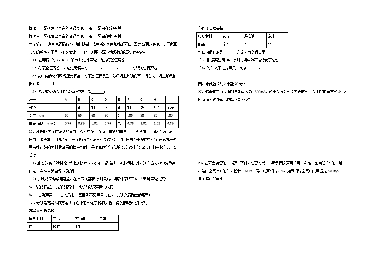 2.同学将耳朵贴在一根20m铁管的一端,乙同学在另一端用力敲一下铁管,甲同学能听到﹙空气中声速为340m/s,铁中声速为5200m/s﹚( )