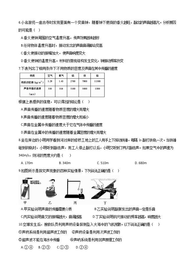 6.小名游览一座古寺时发现里面有一个变音钟,随着钟下燃烧的香火越旺,敲出的声音越高亢。分析原因的可能是( )