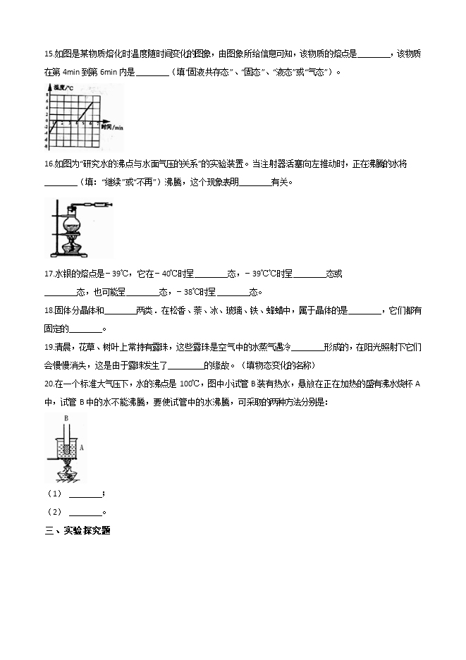 14.如图所示是某物质在熔化时温度随时间变化的图像。由图可知:该物质是________(填“晶体”或“非晶体”),其中BC段物质处于________状态(填“固体”、“液体”或“固液共存”)。