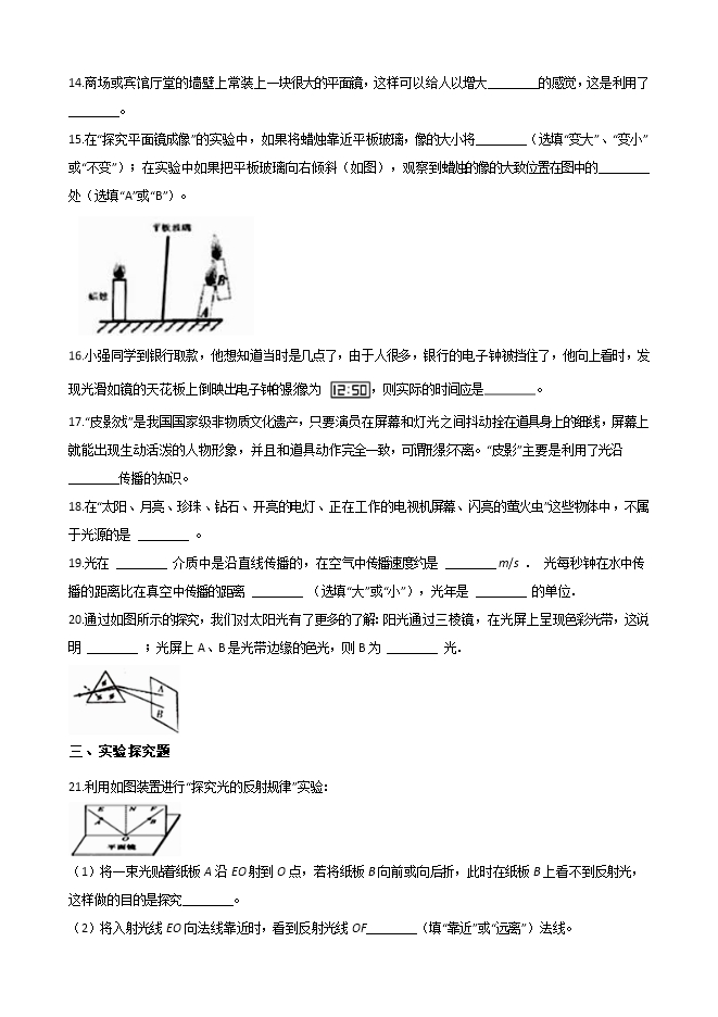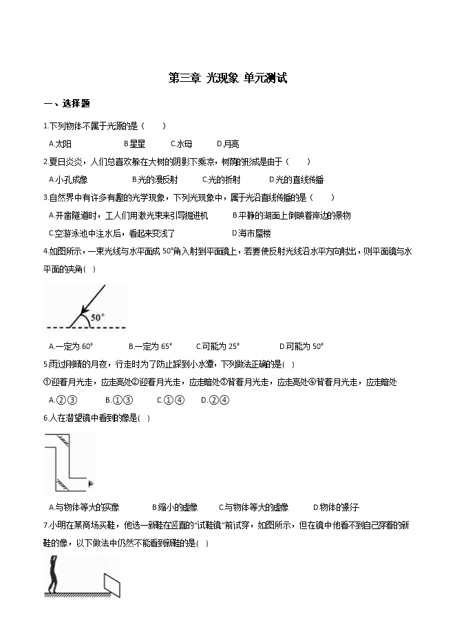 2018-2019学年苏科版八年级上册物理第三章 光现象 单元测试题(含答案)