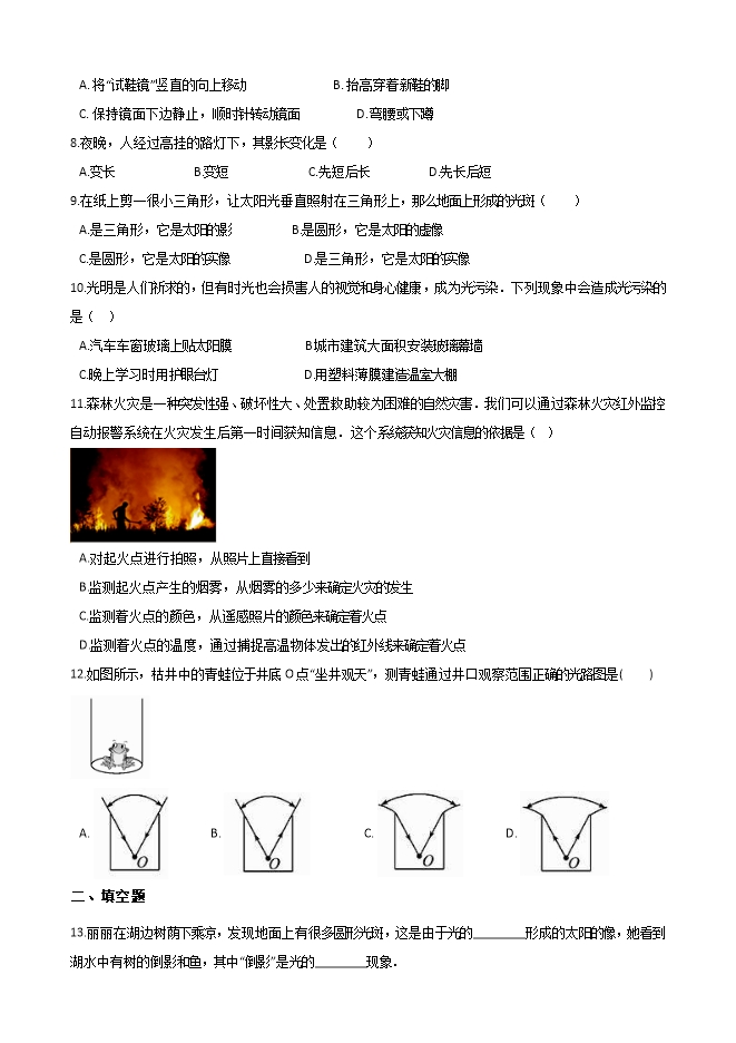 8.夜晚,人经过高挂的路灯下,其影长变化是( )