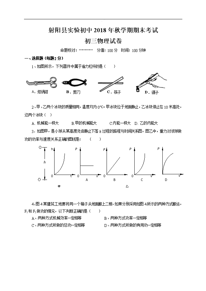 4.图4某建筑工地要将同一个箱子从地面搬上二楼,如果分别采用如图4所示的两种方式搬运,F1和F2做功的情况,以下判断正确的是( )