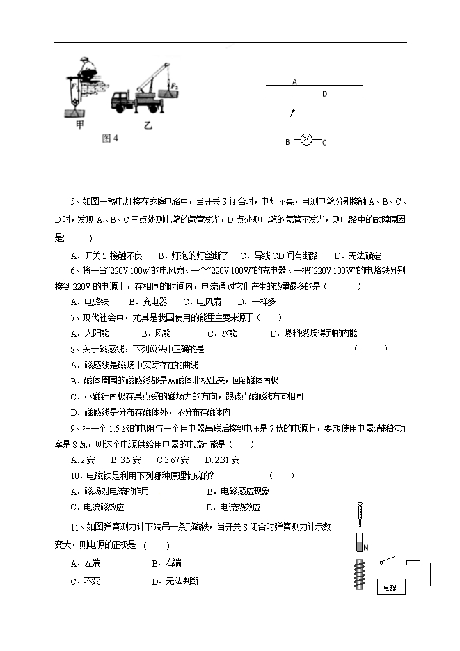 5、如图一盏电灯接在家庭电路中,当开关S闭合时,电灯不亮,用测电笔分别接触A、B、C、D时,发现A、B、C三点处测电笔的氖管发光,D点处测电笔的氖管不发光,则电路中的故障原因是( )