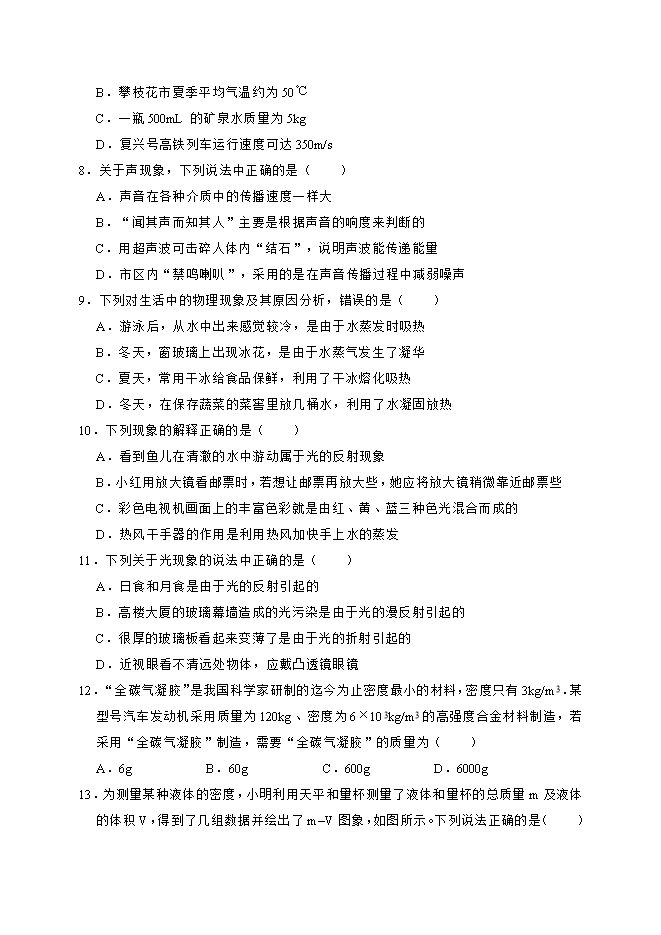 【点评】对日常生活中的速度、质量、长度、温度等进行准确的估测,是要求初中学生掌握的一种基本能力,平时注意观察,结合所学知识多加思考,逐渐培养这方面的能力。