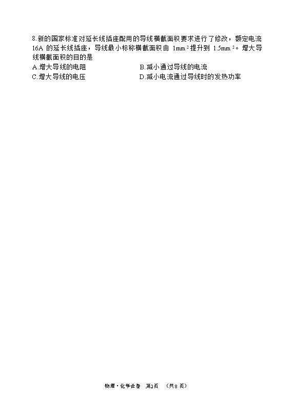 8.新的国家标准对延长线插座配用的导线横截面积要求进行了修改,额定电流 16A 的延长线插座,导线最小标称横截面积由 1mm2 提升到 1.5mm2。增大导线横截面积的目的是