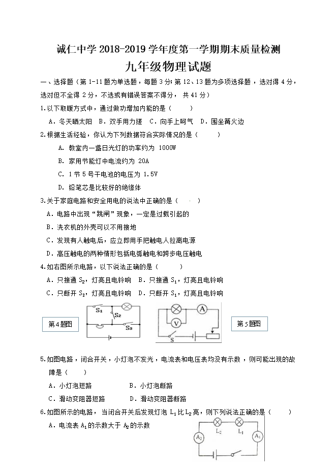 内蒙古巴彦淖尔市磴口县诚仁中学2019届九年级上学期期末考试物理试题及答案