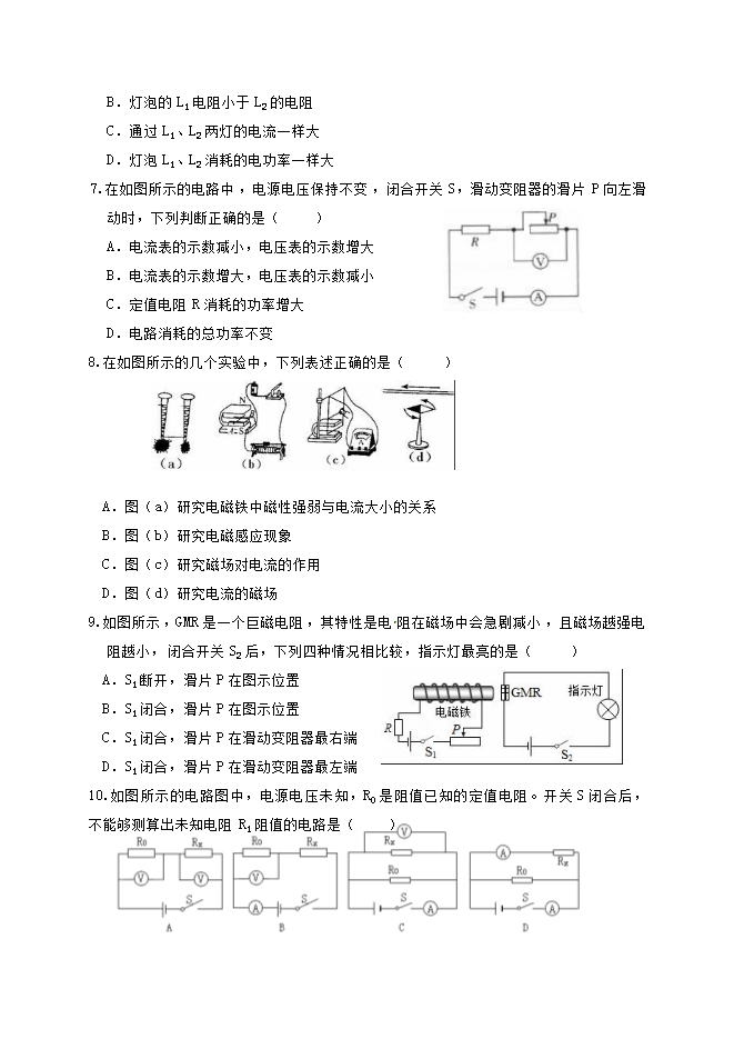 9.如图所示,GMR是一个巨磁电阻,其特性是电 阻在磁场中会急剧减小,且磁场越强电阻越小,闭合开关S2后,下列四种情况相比较,指示灯最亮的是( )
