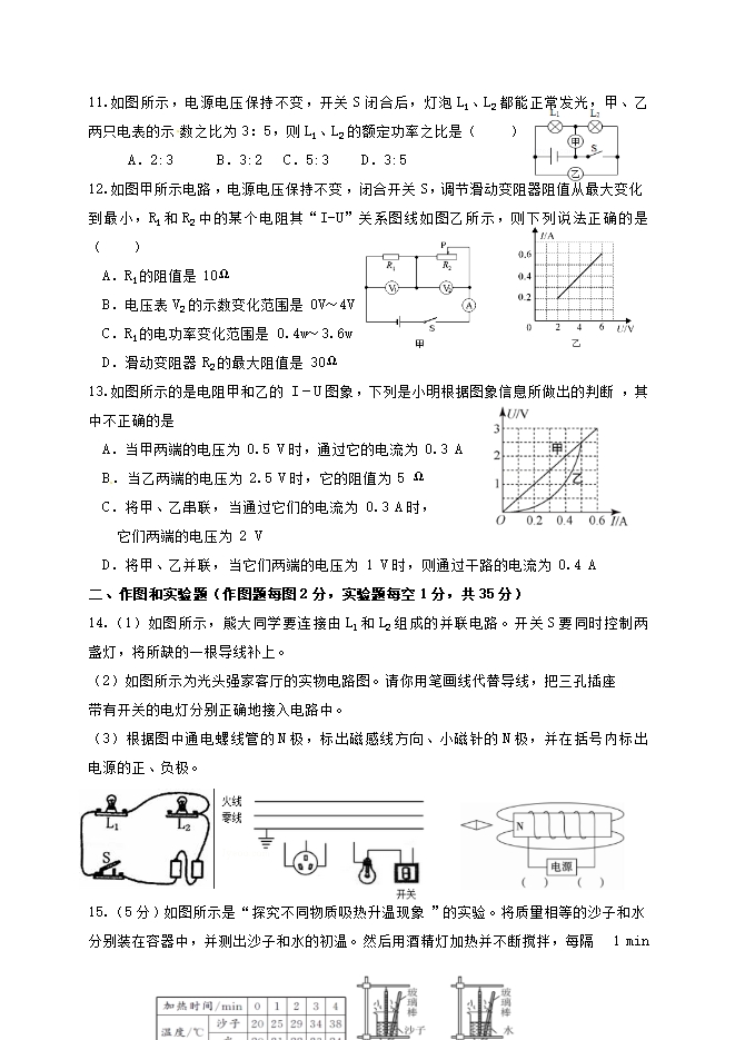 11.如图所示,电源电压保持不变,开关S闭合后,灯泡L1、L2都能正常发光,甲、乙两只电表的示 数之比为3:5,则L1、L2的额定功率之比是( )