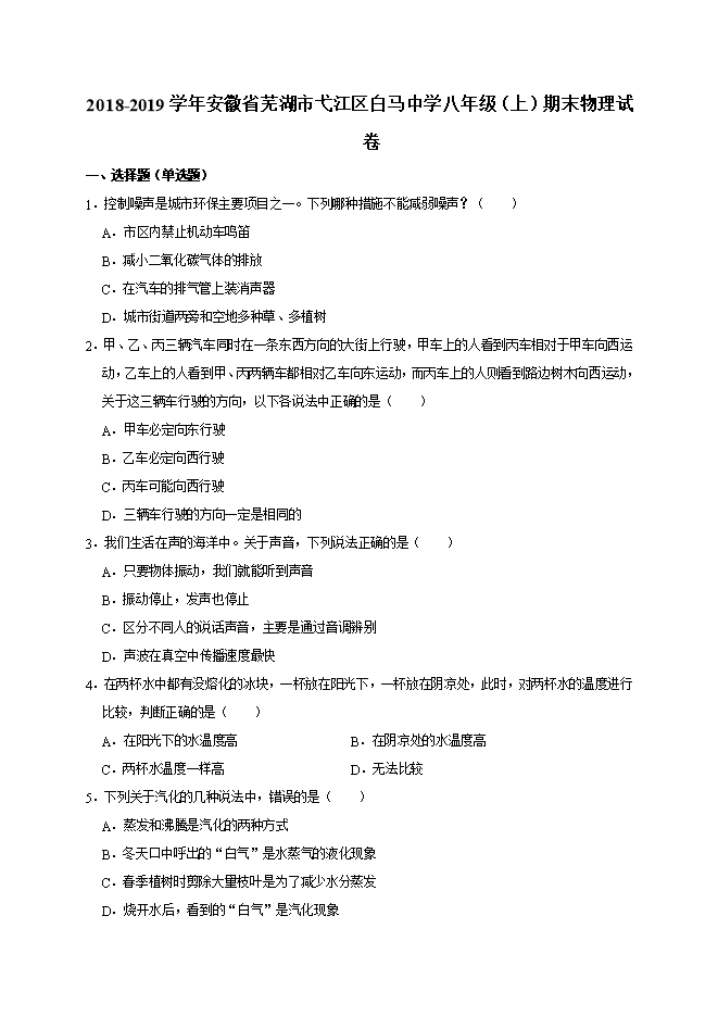 2018-2019学年安徽省芜湖市弋江区白马中学八年级(上)期末物理试卷(解析版)