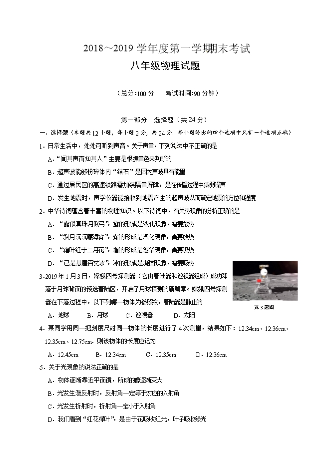 江苏省泰州市姜堰区2018-2019学年八年级上学期期末考试物理试题及答案