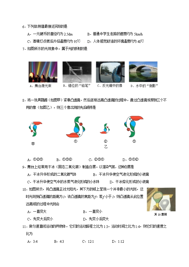 10.如图所示,将凸透镜正对太阳光,其下方的纸上呈现一个并非最小的光斑,这时光斑到凸透镜的距离为l,该凸透镜的焦距为f,若f小于l,则凸透镜从此位置远离纸的过程中光斑会