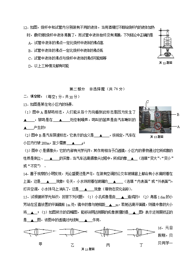 12.如图,烧杯中和试管内分别装有不同的液体,当用酒精灯不断给烧杯内的液体加热时,最终发现烧杯中液体沸腾了,而试管中液体始终没有沸腾.下列结论中正确的是
