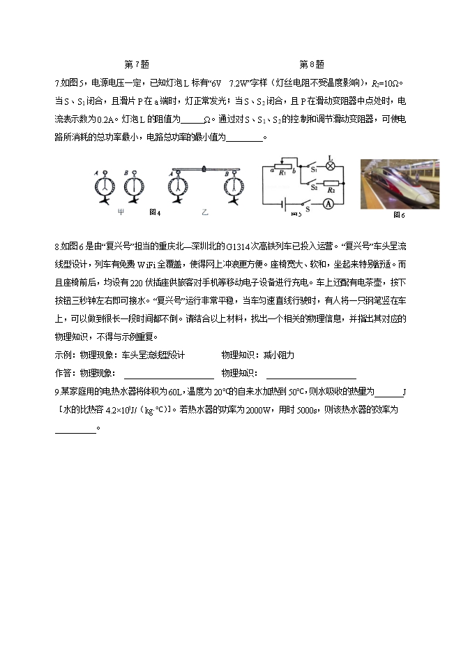 8.如图6是由“复兴号”担当的重庆北—深圳北的G1314次高铁列车已投入运营。“复兴号”车头呈流线型设计,列车有免费W iFi全覆盖,使得网上冲浪更方便。座椅宽大、软和,坐起来特别舒适。而且座椅前后,均设有220伏插座供旅客对手机等移动电子设备进行充电。车上还配有电茶壶,按下按钮三秒钟左右即可接水。“复兴号”运行非常平稳,当车匀速直线行驶时,有人将一只钢笔竖在车上,可以做到很长一段时间都不倒。请结合以上材料,找出一个相关的物理信息,并指出其对应的物理知识,不得与示例重复。