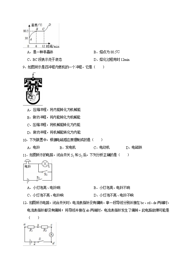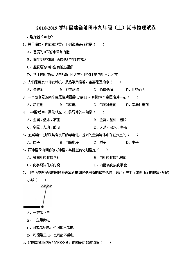 2018-2019学年福建省莆田市九年级(上)期末物理试卷(解析版)