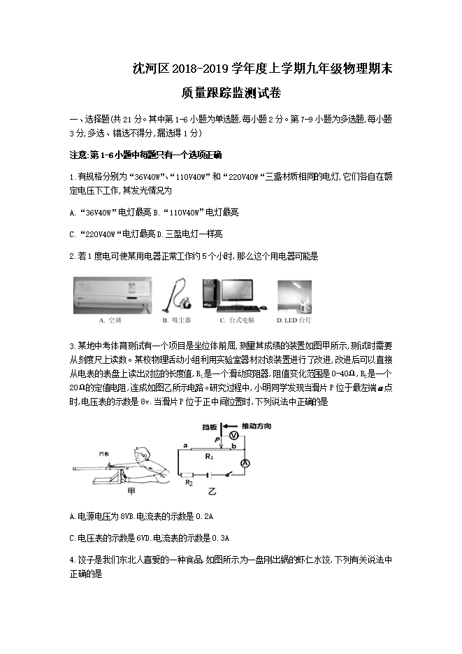 辽宁省沈阳市沈河区2018-2019学年九年级上期末质量跟踪监测物理试题(无答案)