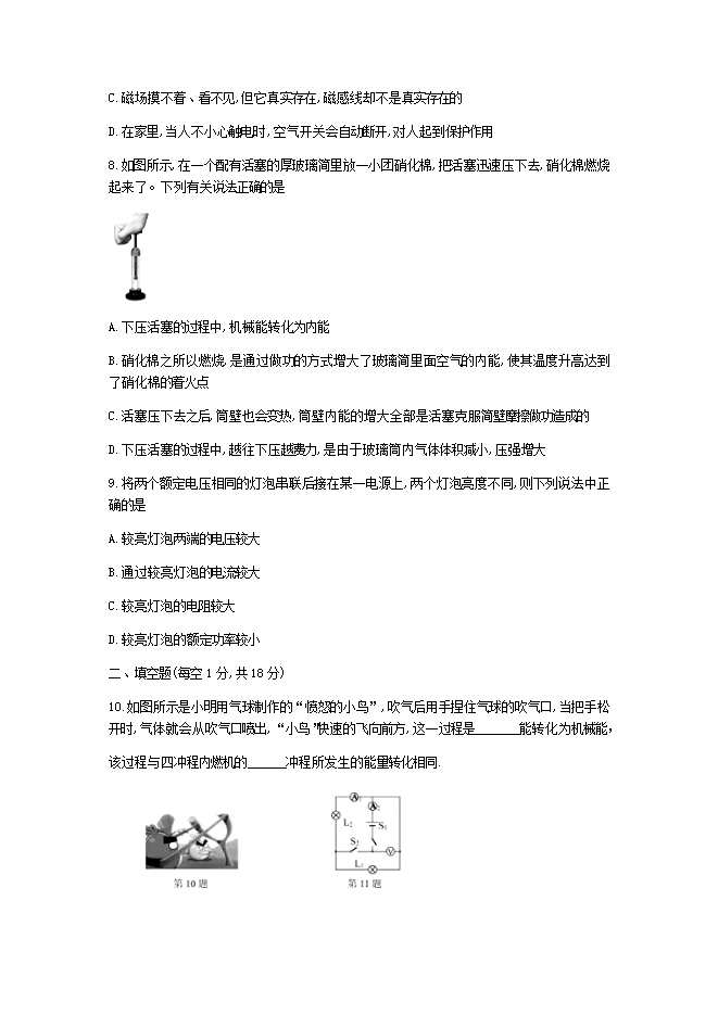 8.如图所示,在一个配有活塞的厚玻璃简里放一小团硝化棉,把活塞迅速压下去,硝化棉燃烧起来了。下列有关说法正确的是